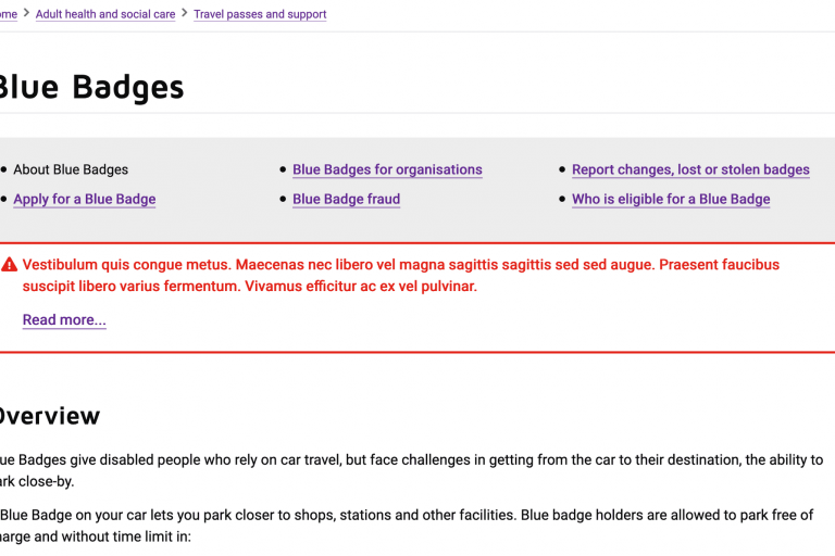 Stephen spent time this sprint extending the Service Status message to support the message being placed in the page on specific paths of the site. This will allow a content designer to create a service status message (to publish an update to the status of a service) and decide which sections of the site it should display on.